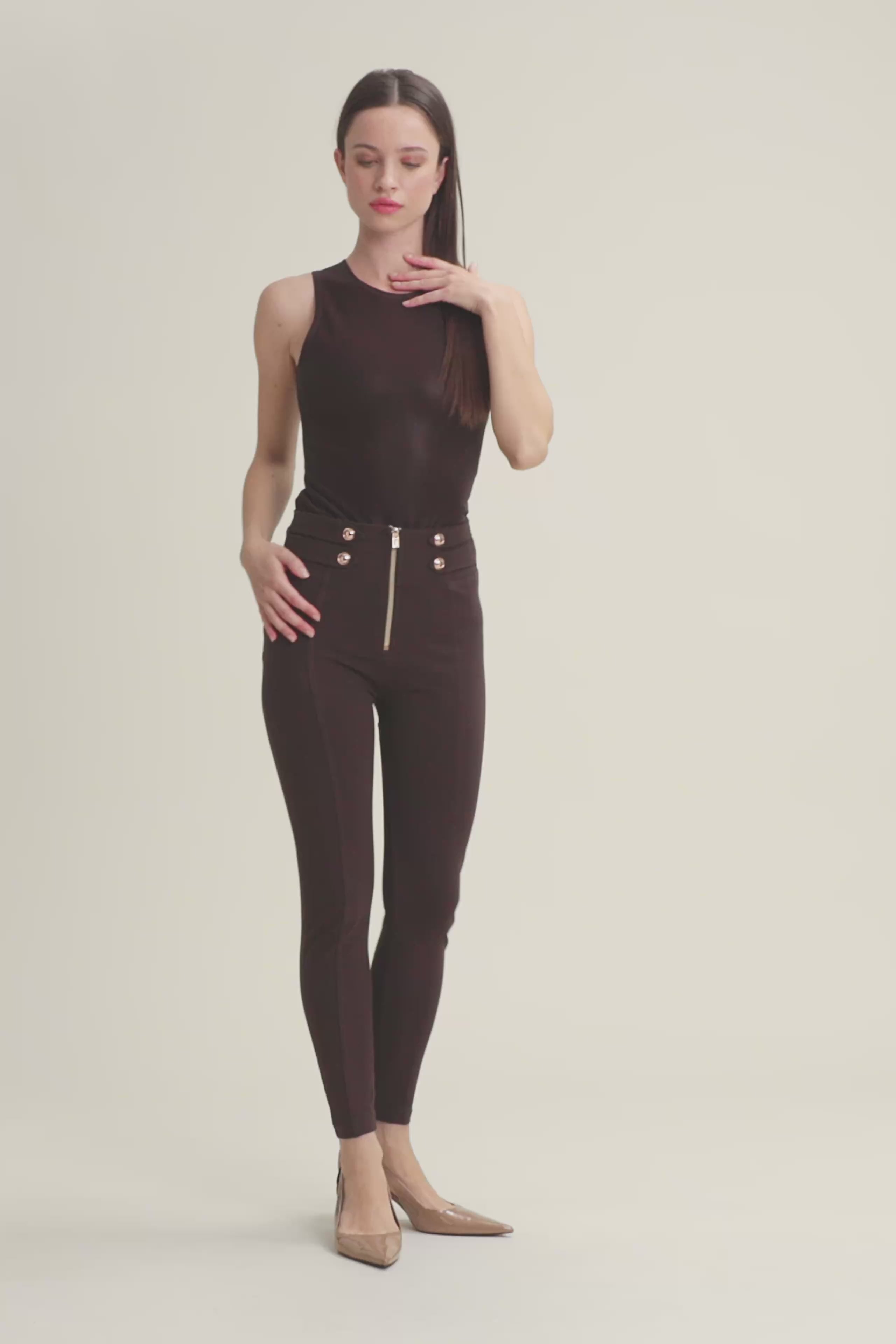WR.UP® super skinny push-up 7/8 length trousers in heavy organic stretch cotton jersey. The decorative ribbons at the waist, fixed by large gold rivets, and the central stitching along the leg give the garment character and originality. High waist with central zip.